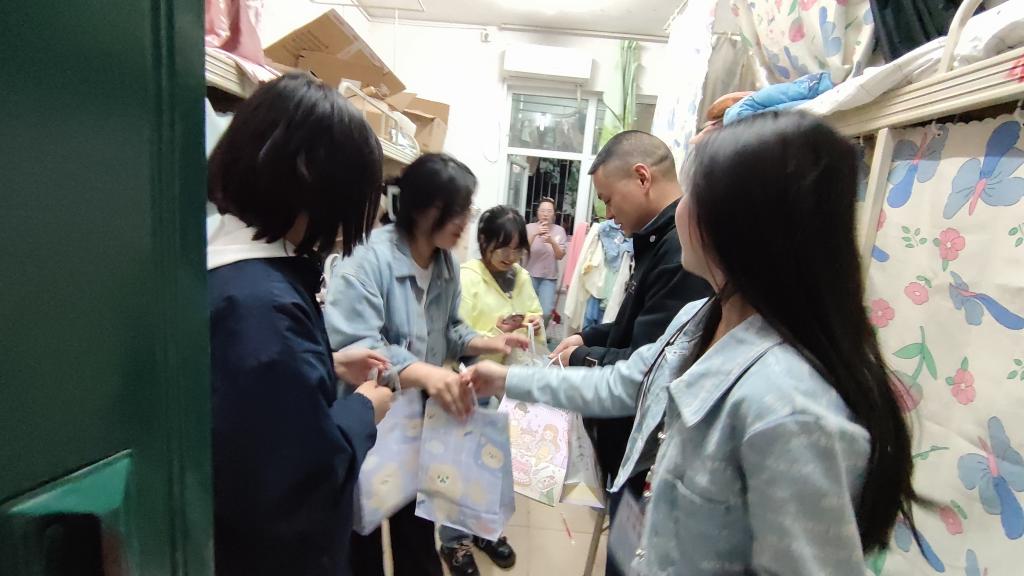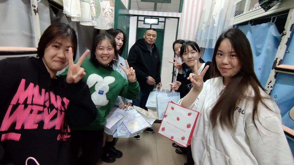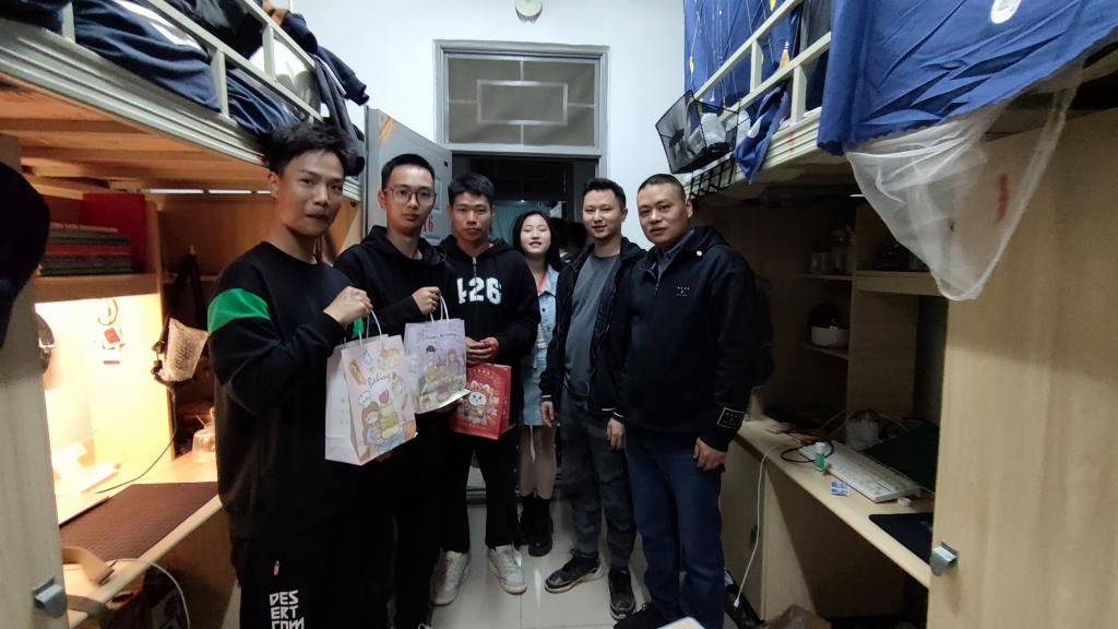 晚上8时,新生军训结束后,辅导员带领团学干部分组慰问新生并发放慰问品。慰问过程中,辅导员、团学干部积极与新生沟通、交流,关心新生军训期间的心理、身体状况。春寒尤在,却抵不住心中潺潺的暖意。“同学们军训辛苦了,有没有什么不习惯的?学习生活进展还顺利吗?”连声地询问,耐心地交谈拉近了师生间的距离。