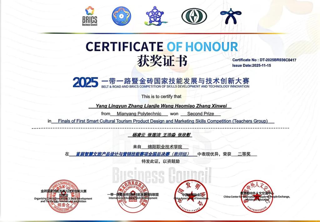 11月11日至13日,2025“一带一路”暨金砖国家技能发展与技术创新大赛首届智慧文旅产品设计与营销技能赛项全国总决赛在广西壮族自治区南宁市落下帷幕,来自全国81支队伍的300余名技能精英同台竞技。经过角逐,公司旅游管理专业群教师杨凌云、张莲洁、王浩淼、张欣慰组成的团队荣获二等奖。公司荣获优秀组织奖。